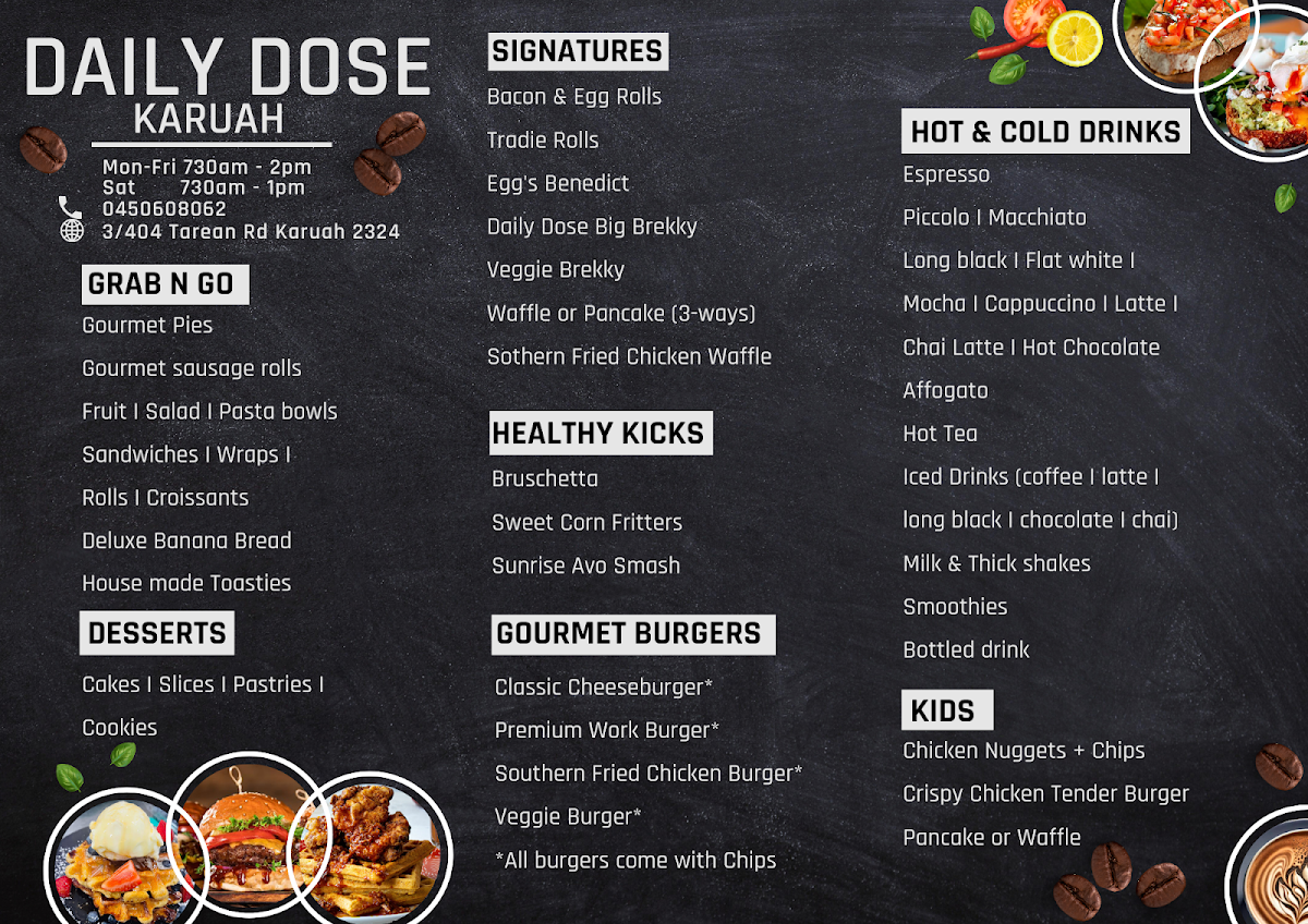 Welcome to Daily Dose Coffee Karuah, a charming café nestled in the quiet town of Karuah, NSW. Located conveniently at 3/404 Tarean Rd, this delightful spot has quickly become a favorite among travelers and locals alike. The menu offers a variety of satisfying options, from freshly made breakfast dishes to delectable pastries. Patrons rave about their hearty bacon and egg rolls and comforting poached eggs on sourdough.